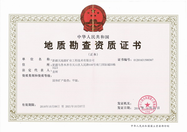 新疆天地源地勘公司成立于2004年,歷經十余年的發(fā)展,現持有地質勘查甲級資質和ISO9001:2008質量管理體系認證證書。